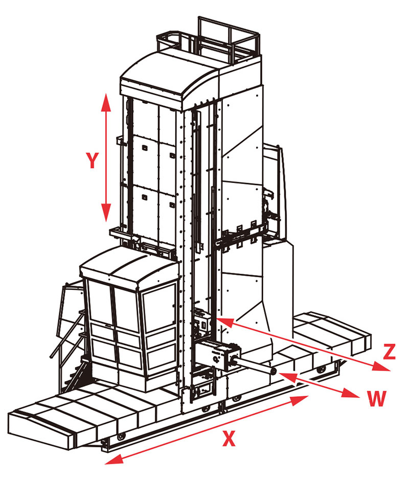 移動(dòng)部件的移動(dòng)和固定 所有四軸(X,Y,Z,W)都配置獨(dú)立的數(shù)控控制的伺服驅(qū)動(dòng)系統(tǒng)。 Y,Z,W軸采用帶預(yù)緊螺母的滾珠絲杠傳動(dòng),X軸采雙伺服電機(jī)驅(qū)動(dòng)。X軸的齒輪齒條傳動(dòng)系統(tǒng)帶主從消隙機(jī)構(gòu)。 |